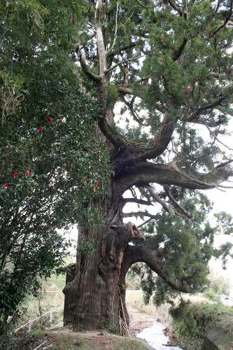 | 旧東海道を横切る大沙川の堤上に、樹高26m、周囲6m、樹令約750年の杉がある。この大杉を古来より弘法杉、または二本杉と人々はよんでいる。 伝説によれば、もとは2本あって並立していたが、洪水のために堤防が崩壊して一樹は倒れたといわれている。昔からこの地方の子どもが左手で箸を持って食事をするものは、この木の枝で箸を作って使用させると自然と右手で食事をするようになるといわれている。 そのために、下の方の枝はたいてい切り取られていたと伝えられている。 一説によれば弘法大師(空海)がこの地方を通過した時、二本の木を植えたとも、また弘法大師か食事をしたあと杉箸を差しておいたのが芽を出したとの説かある。その後、大風のために折れて朽ちたので里人が再び植えたが、安永2年(1773)の台風でそのうち一本が倒れたとも言われている。平成6年3月 甲西町教育委員会 |
